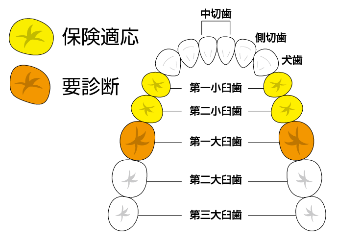 セラミックとプラスチックを混ぜ合わせたやわらかい材質で周囲の歯を傷つけません。第一小臼歯と第二小臼歯が、保険適応になりました。なお、第一大臼歯(6番目の歯)はかみ合わせ診断を行う必要があり、対象は下顎の6番目のみです。